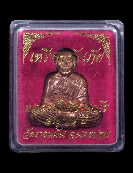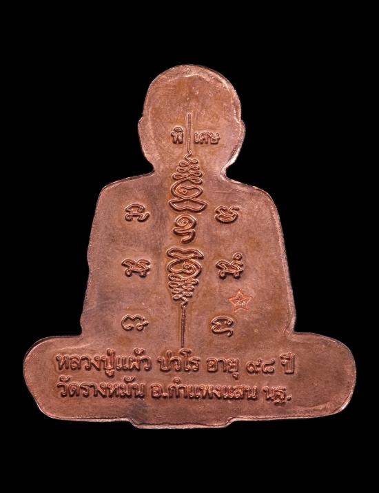 เหรียญกันภัยปั๊มตัดชิด 98 ปี หลวงปู่แผ้ว วัดรางหมัน ปี2563 เนื้อทองแดง พร้อมกล่องเดิม