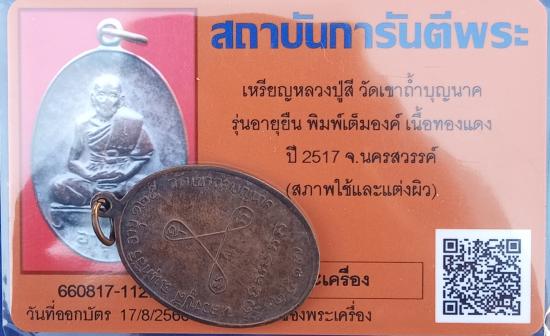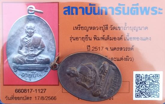 เคาะเดียวแดง+++เหรียญหลวงปู่สี วัดเขาถ้ำบุญนาค รุ่นอายุยืน พิมพ์เต็มองค์ เนื้อทองแดง ปี2517 จ.นครสวรรค์ (พร้อมบัตรรับรองพระแท้สภาพใช้และแต่งผิว)
