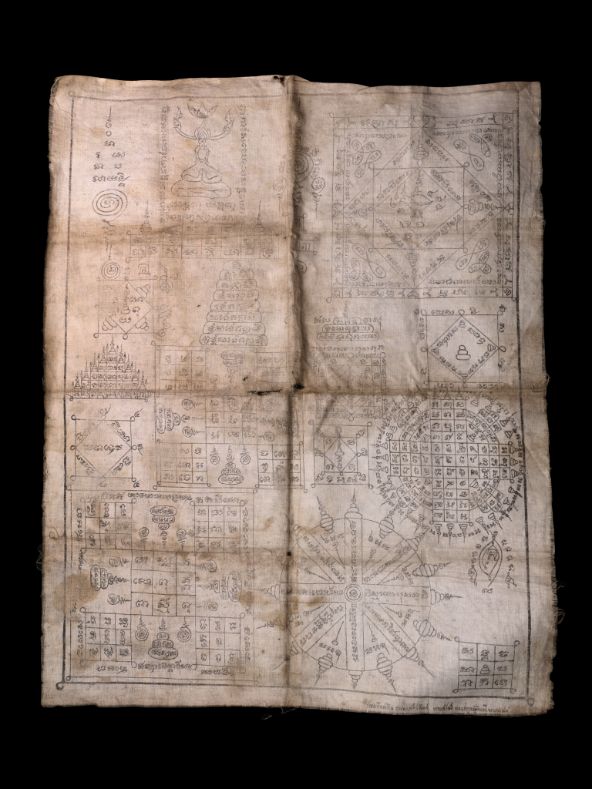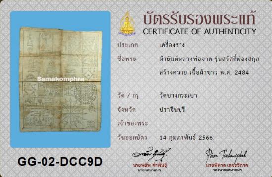 ผ้ายันต์หลวงพ่อจาด วัดบางกระเบา รุ่น สวัสดิ์ ผ่องสกุลสร้างถวาย เนื้อผ้าขาว ปี2484 พร้อมบัตรสมาคม