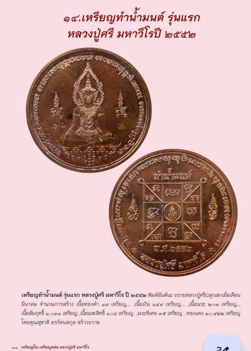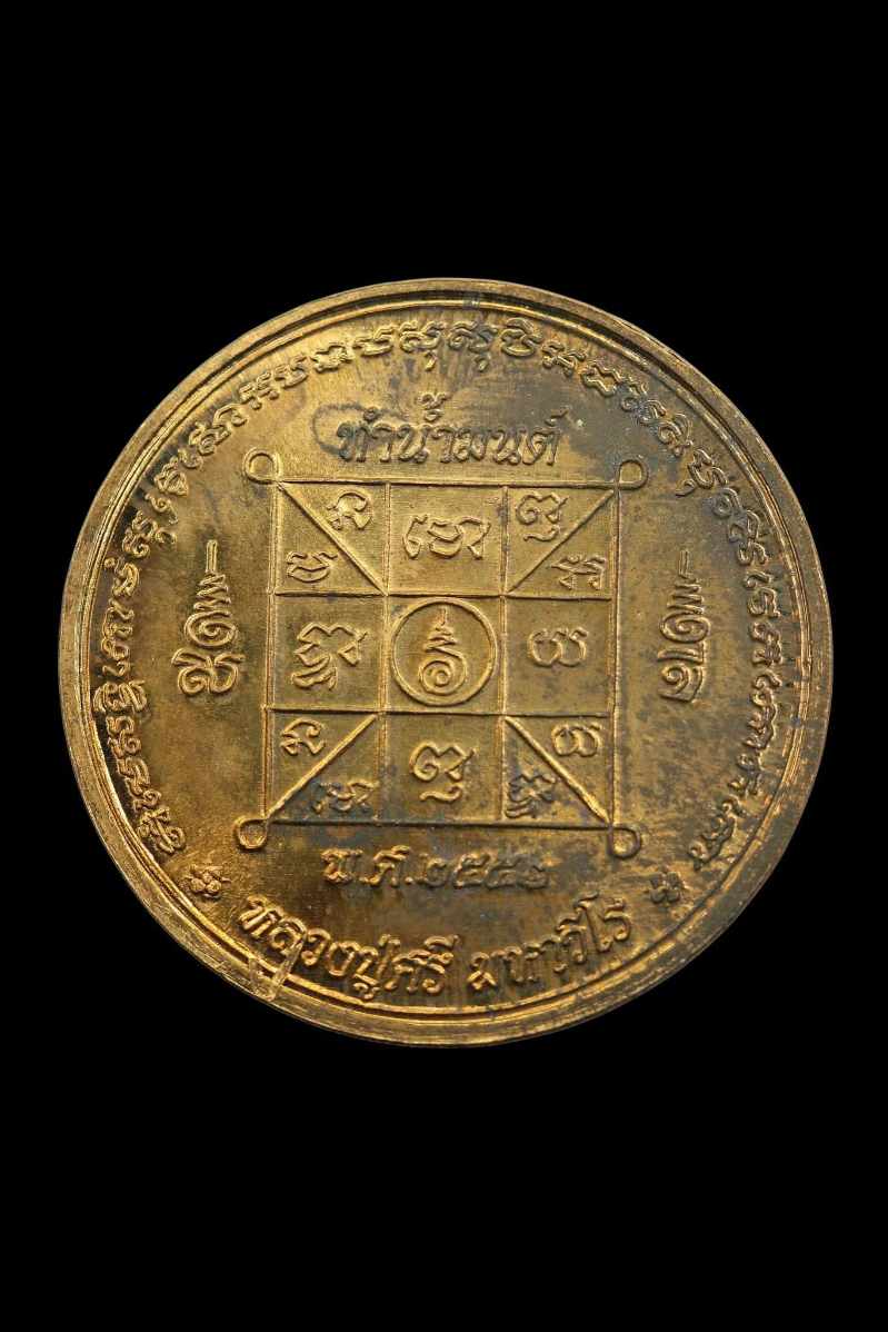 เหรียญทำน้ำมนต์หลวงปู่ศรี มหาวีโร วัดป่ากุง ร้อยเอ็ด รุ่นแรก ปี ๒๕๕๒ เนื้อสัมฤทธิ์ พิมพ์ยันต์นะมหาเศรษฐี ไม่มีกล่อง มีคราบจากการเก็บ