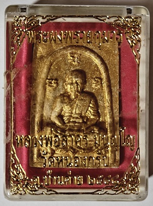 พระผงพรายกุมารเศียรโต หลวงพ่อสาคร วัดหนองกรับ เนื้อขาว ทาทอง พ.ศ.2547 มีรอยจารมือหลวงพ่อสาคร พร้อมใบประกาศงานใหญ่รางวัลที่ 1