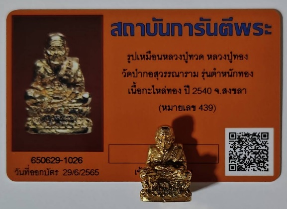 หลวงปู่ทวด รุ่นตำหนักทอง หลวงปู่ทอง สุสังวโร วัดป่ากอสุวรรณาราม อ.นาหม่อม จ.สงขลา ปี2540 กะไหล่ทอง ตอกโค๊ด ตอกหมายเลข 439