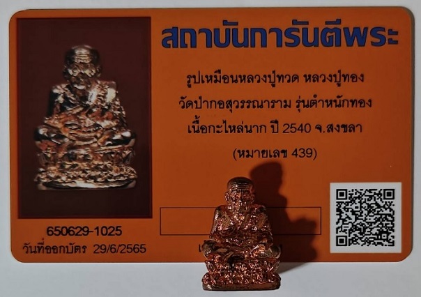 หลวงปู่ทวด รุ่นตำหนักทอง หลวงปู่ทอง สุสังวโร วัดป่ากอสุวรรณาราม อ.นาหม่อม จ.สงขลา ปี2540 กะไหล่นาก ตอกโค๊ด ตอกหมายเลข 439