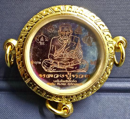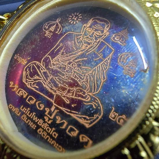 เนื้อนวะโลหะผิวรุ้ง(นำฤกษ์) เลเซอร์พื้นยันต์รอบวง หลังเลเซอร์หลวงปู่ทวด โค๊ดรอบ พร้อมคำสวด ใส่กรอบ3ห่วงชุบทอง24Kฝังเพชร
