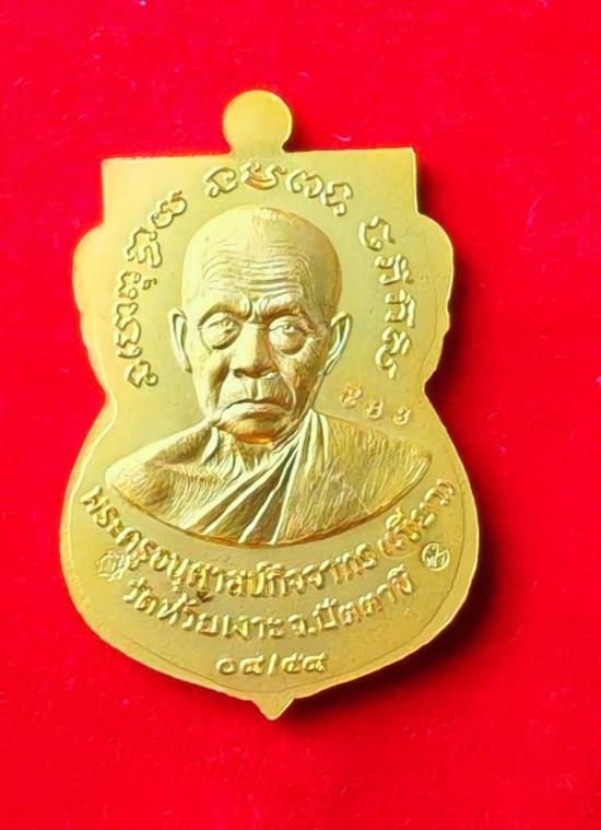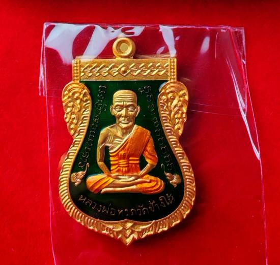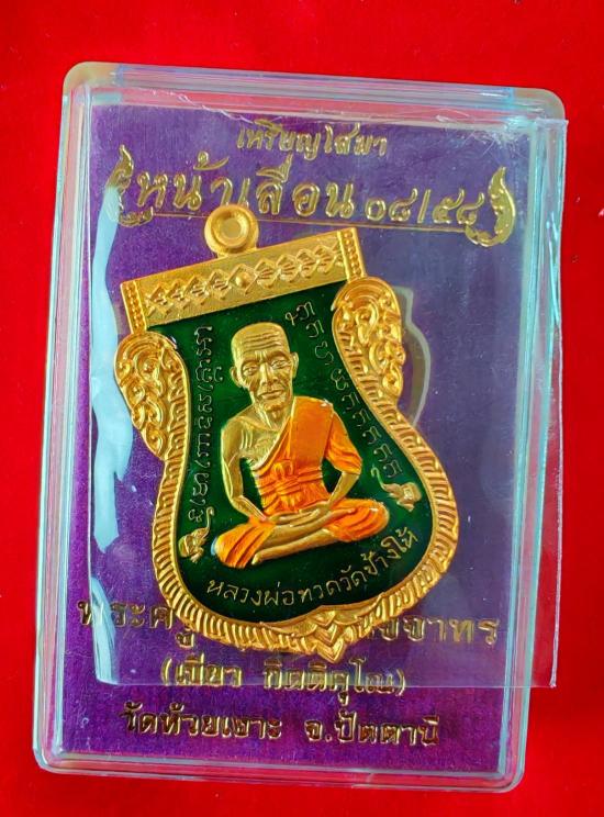 เหรียญเสมาหน้าเลื่อน 08/58 พ่อท่านเขียว วัดห้วยเงาะ ปัตตานี เนื้อกระไหล่ทอง ลงยาสีเขียว #263