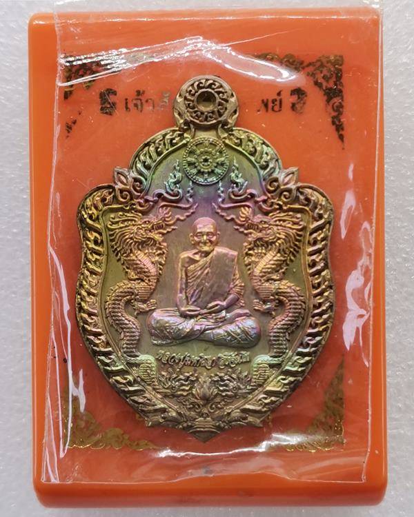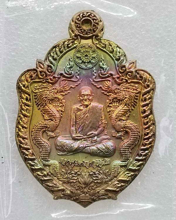 หลวงปู่มหาศิลา สิริจันโท .. เหรียญมังกรคู่ เจ้าสัวอุดมทรัพย์ เนื้อปลอกลูกปืนผิวรุ้ง พร้อมกล่อง