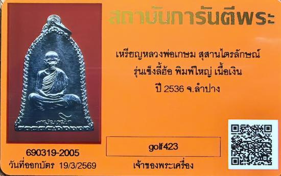 เหรียญระฆัง หลวงพ่อเกษม รุ่นเซ็งลี้ฮ้อ เนื้อเงิน พิมพ์ใหญ่ + บัตรรับรองจากเว็บ (แดง 15,000)