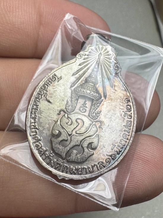ด้านหลัง พระปรมาภิไธยย่อ ภปร. พระจุลมงกุฎเปล่งรัศมีอยู่เบื้องบน โดยเสด็จพระราชกุศลสร้างตึกพยาบาล ๑๖ มีนาคม ๒๕๒๑