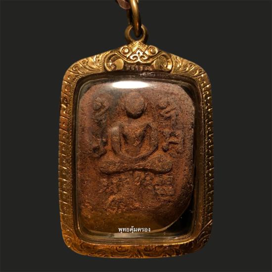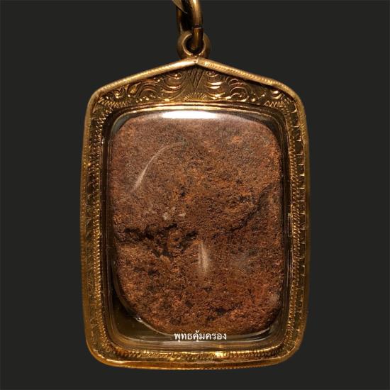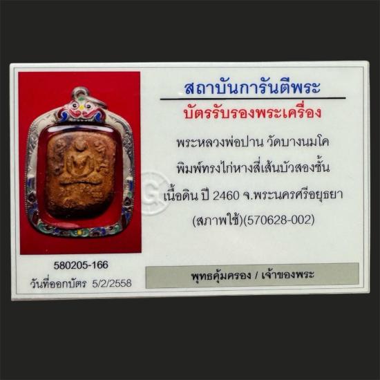 พระหลวงพ่อปาน วัดบางนมโค พิมพ์ทรงไก่หางสี่เส้นบัวสองชั้น เนื้อดิน ปี 2460 จ.พระนครศรีอยุธยา (สภาพใช้) ยังมีผงอยู่ เลี่ยมทอง พร้อมบัตรรับประกัน