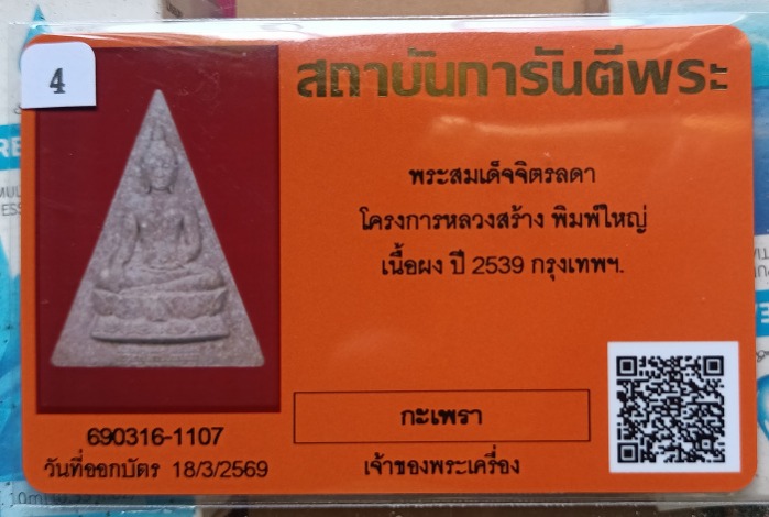พระสมเด็จจิตรลดาโครงการหลวงสร้าง พิมพ์ใหญ่ เนื้อผง ปี2539 กรุงเทพ พร้อมกล่องเดิม มีบัตรรับรอง
