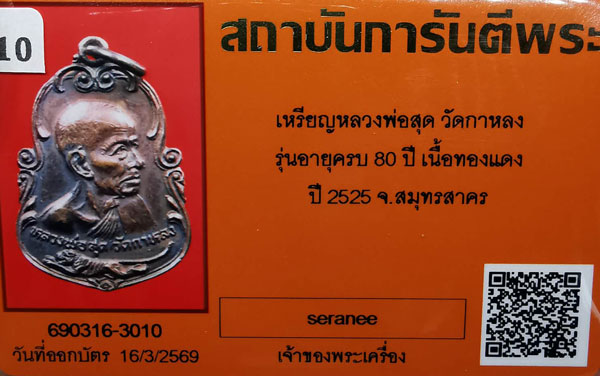เหรียญหลวงพ่อสุด วัดกาหลวง รุ่นอายุครบรอบ80ปี(รางคู่) เนื้อทองแดง ห่วงเดิม ปี2525 จ.สมุทรสาคร + บัตรG-pra สภาพสวยเดิมค่ะ
