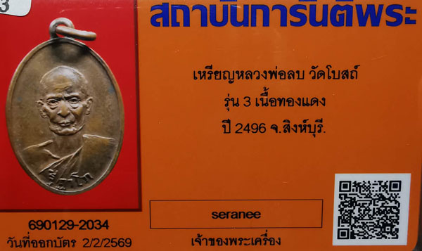 เหรียญหลวงพ่อลบ วัดโบสถ์ รุ่น3 เนื้อทองแดง ห่วงเดิม ปี2496 จ.สิงห์บุรี + บัตรG-pra สภาพเดิมค่ะ