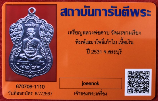 เหรียญเสมาโพธิ์เก้า หลวงพ่อตาบ วัดมะขามเรียง ( เนื้อเงิน ) ตอกโค๊ต จ.สระบุรี ปี 2531 เนื้อเงิน สร้างจำนวน 300 เหรียญเท่านั้น สร้างน้อย หายาก สภาพสวย มาพร้อมบัตรรับรองครับ