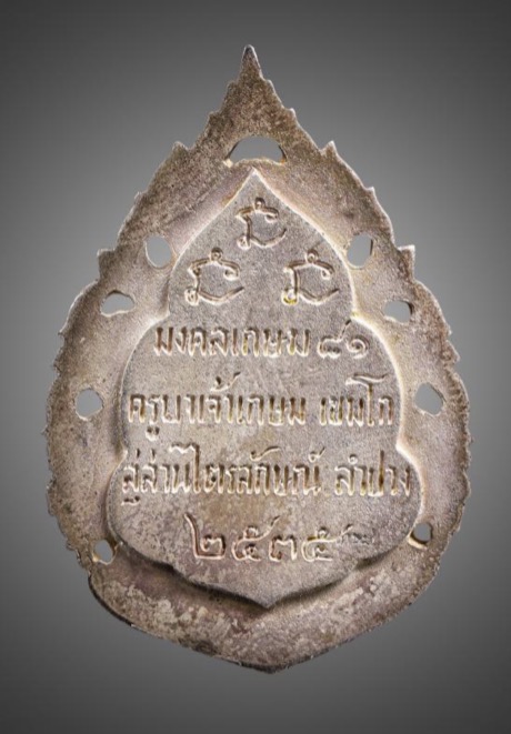 เหรียญหล่อลายฉลุ เนื้อเงิน รุ่นแรก มงคลเกษม 81 ของ หลวงพ่อเกษม เขมโก แห่งสำนักสุสานไตรลักษณ์ จังหวัดลำปางปีที่สร้าง: จัดสร้างขึ้นในปี พ.ศ. 2535 เพื่อเป็นที่ระลึกในโอกาสที่หลวงพ่อเกษมมีอายุครบ 81 ปี ลักษณะเหรียญ: เป็นเหรียญหล่อที่มีลวดลายฉลุวิจิตรบรรจง ตรงกลางเป็นรูปเหมือนหลวงพ่อเกษมนั่งสมาธิเต็มองค์ เนื้อโลหะ: จากลักษณะในภาพคาดว่าเป็น เนื้อนวโลหะ ซึ่งเป็นเนื้อที่ได้รับความนิยมสูงในรุ่นนี้ นอกจากนี้ยังมีเนื้ออื่นๆ เช่น เนื้อเงิน และเนื้อทองคำ