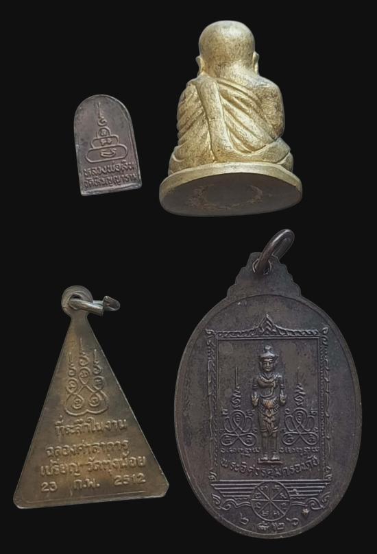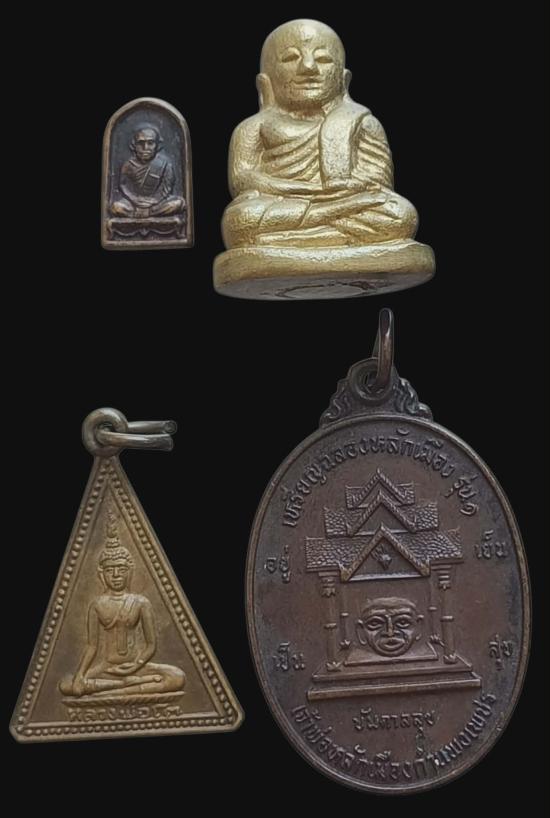พร้อมกันทีเดียว 4 องค์ครับ พระปรกใบมะขาม หลวงพ่อเงิน +รูปหล่อหลวงพ่อเงิน รุ่นฟันปลา ปี33 ++ เหรียญหลวงพ่อโต วัดทุ่งน้อย พิจิตร ปี2512 เนื้อฝาบาตร + เหรียญฉลองหลักเมืองรุ่น1 เจ้าพ่อหลักเมืองกำแพงเพชร