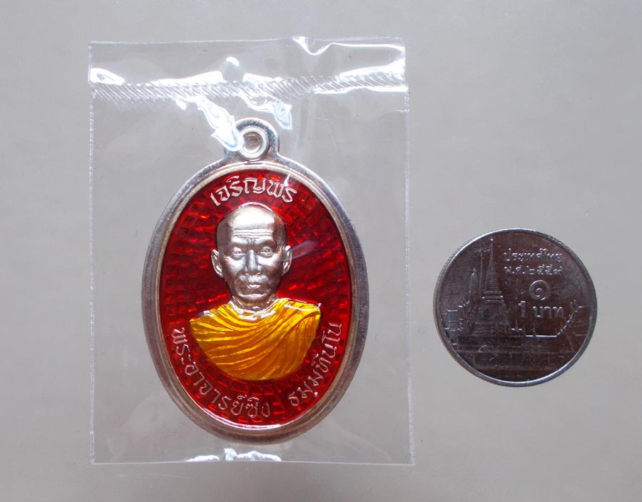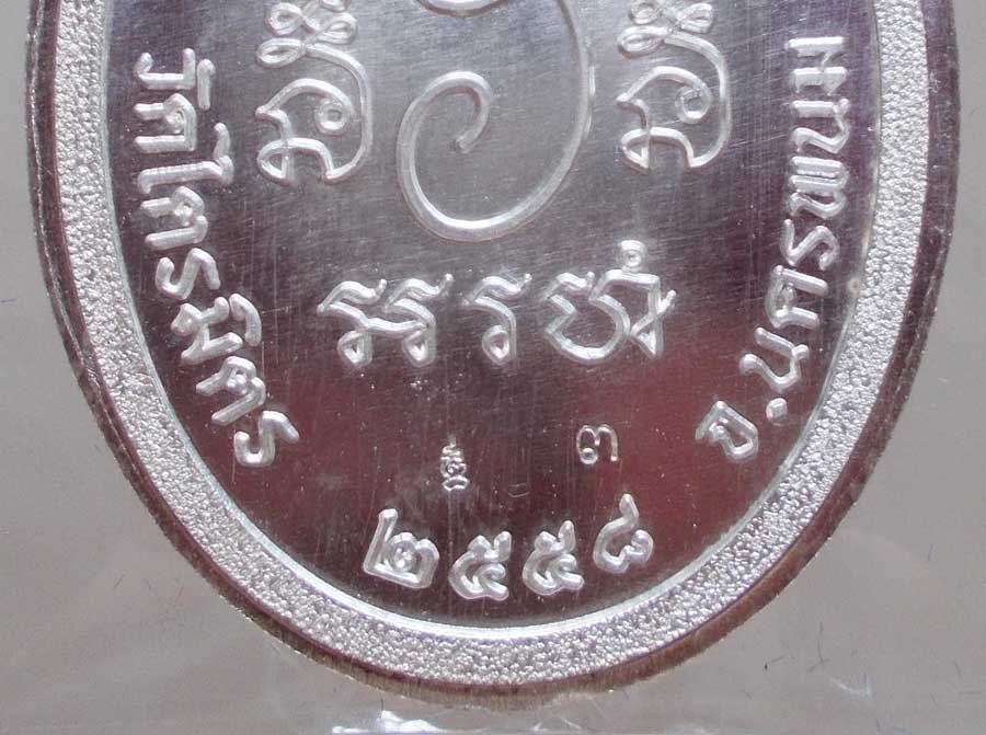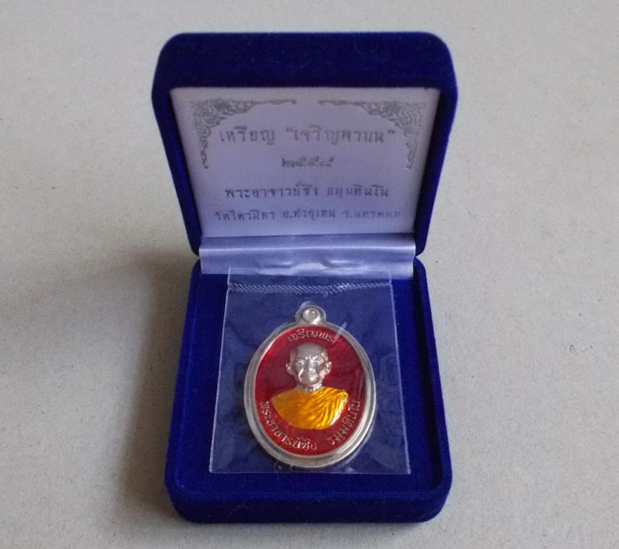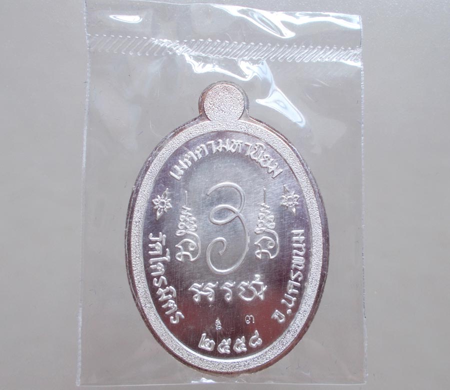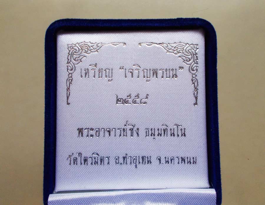 เหรียญ " เจริญพรบน " พระอาจารย์ซิง ธมฺมทินโน วัดไตรมิตร จ.นครพนม พ.ศ.2558 เนื้อเงินลงยาไม่ตัดปีก ตอกโค๊ต ตอกเลข สภาพสวยกล่องเดิมๆ !!