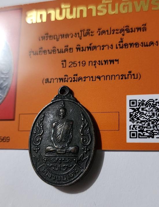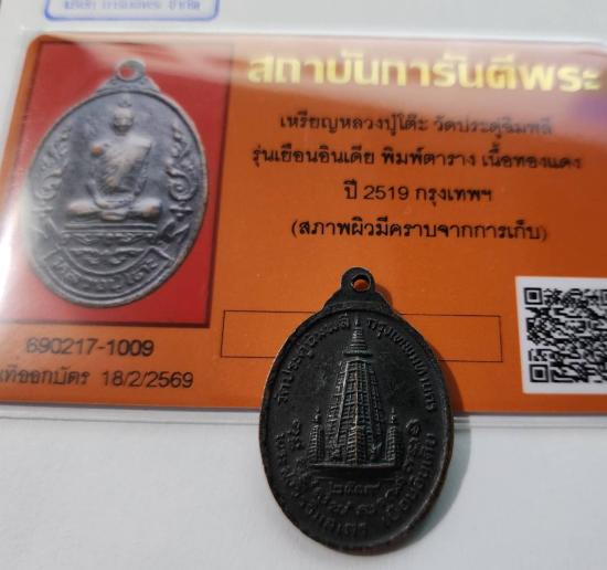 เหรียญหลวงปู่โต๊ะ วัดประดู่ฉิมพลี รุ่นเยือนอินเดีย เนื้อทองแดง ปี 2519 (บล็อกตาราง ยอดนิยม)สภาพผิวเดิมๆตามบัตรรับรองการันตีพระ