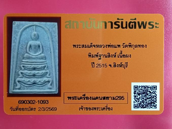 พระสมเด็จฐานสิงห์ อนุสรณ์จากพระมหาวิหารพระเขี้ยวแก้ว(พระทันตธาตุ) ประเทศสาธารณรัฐศรีลังกา หลวงพ่อแพ วัดพิกุลทอง ปลุกเสกเดี่ยวตลอดไตรมาส พ.ศ.๒๕๑๕ จัดพิธีพุทธาภิเษกใหญ่ในวันเสาร์ที่ ๒๑ ตุลาคม ๒๕๑๕ ตรงกับวันขึ้น ๑๔ ค่ำ เดือน ๑๑ ปี ชวด อนุสรณ์จากเมืองแคนดี้ สาธารณรัฐศรีลังกา ในวาระที่หลวงพ่อแพท่านได้นำคณะศรัทธาญาติโยมศิษยานุศิษย์เดินทางจาริกแสวงบุญไปนมัสการพระทันตธาตุ-พระเขี้ยวแก้วของสมเด็จพระบรมศาสดาสัมมาสัมพุทธเจ้า มาพร้อมบัตรรับรองจากสถาบันการันตีพระค่ะ