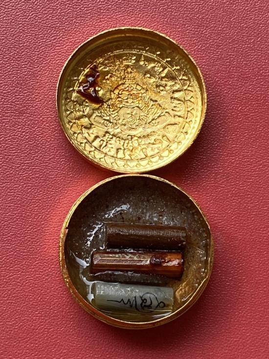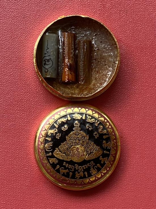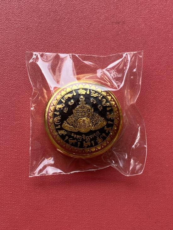 เคาะเดียวแดง สีผึ้งพระราหู รุ่น มงคลจักรวาล เนื้อ โลหะชุบทองลงยาสีดำขอบสีแดง ขนาด3.2ซม