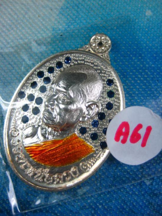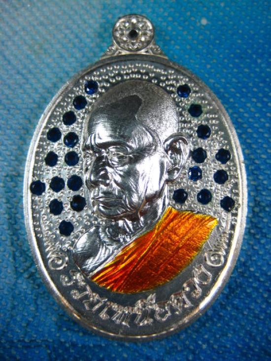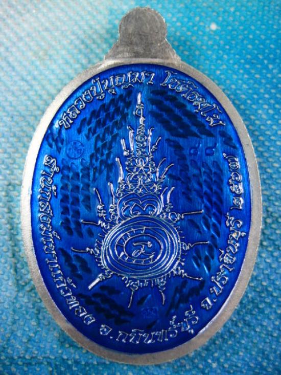 เหรียญ รวยเหนือดวง เนื้อกะหลั่ยเงิน ฝังทับทิมพื้นด้านหน้า ด้านหลังลงยาน้ำเงิน ลงยาจีวร หลวงปู่บุญมา ไม่มีกล่องเดิม แต่มีกล่องแทนให้ (---A61---)