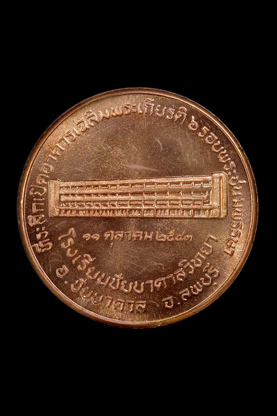 เหรียญกลม ที่ระลึกเปิดอาคารเฉลิมพระเกียรติ 6 รอบพระชนมพรรษา โรงเรียนชัยบาดาลวิทยา อ.ชัยบาดาล จ.ลพบุรี ( เนื้อทองแดง ) วันที่ 11 ตุลาคม พ.ศ.2543