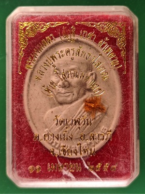 พระผงเมตตา(อัฏฐิ เกศา ผ้าเพดาน )พระครูสัทธาโสภณ วัดเวฬุวัน สารภี เชียงใหม่ ปี2558 พร้อมกล่องเดิม