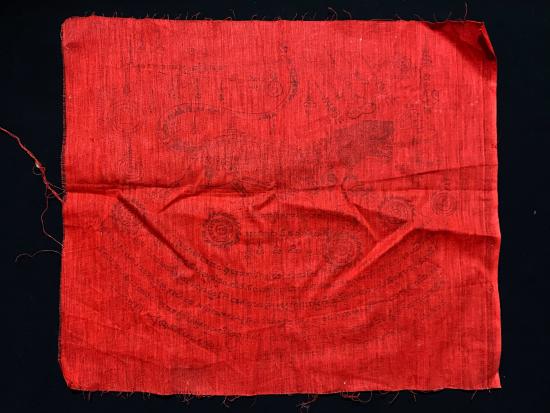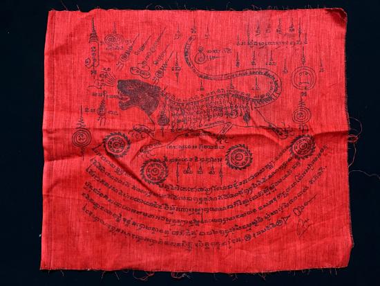 ผ้ายันต์เสือถีบจักร อาจารย์อุทัย ดุจศรีวัชร์ พิมพ์หมึกดำบนผ้าสีแดง