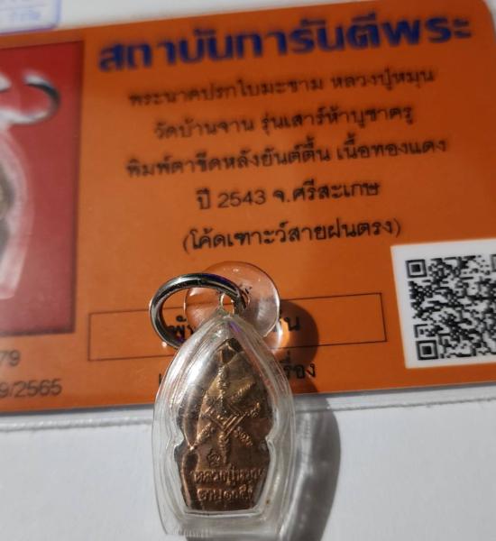 (เต็มฟอร์ม ตาขีดหลังยันต์ โค๊ตเฑาะสายฝนตรง ) ปรกใบมะขาม หลวงปู่หมุน วัดบ้านจาน รุ่นเสาร์ห้าบูชาครู เนื้อทองแดง พิมพ์ตาขีดหลังยันต์ตื้น ปี2543(โค๊ตเฑาะว์สายฝนตรง) พร้อมบัตรรับรองไม่ต้องวัดใจสภาพพระแท้