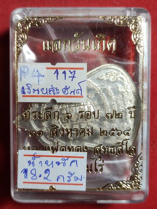 เหรียญทำบุญแจกงานวันเกิด หลวงพ่อทอง สุทธสีโล ที่ระลึกครบ 6 รอบ 72 ปี ออกวัดบ้านไร่ ปี64 เนื้อ เงินหลังยันต์ หมายเลข 117 สภาพสวย เคาะเดียวแดง