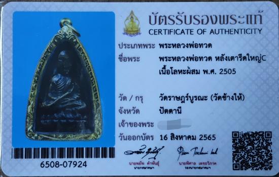 หลวงปู่ทวด หลังเตารีดใหญ่ซี (C) เนื้อโลหะผสม ปี 2505 วัดช้างให้ จ.ปัตตานี พร้อมบัตรรับรองสมาคม 1 ใบ (ไม่รวมกรอบทองนะครับ ไม่มีกรอบแล้ว)