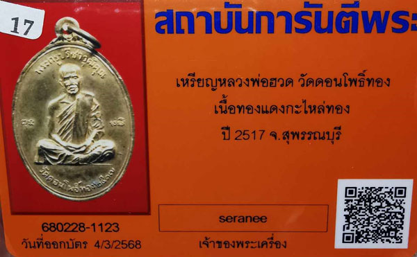 เหรียญหลวงพ่อฮวด วัดดอนโพธิ์ทอง เนื้อทองแดงกะไหล่ทอง ห่วงเดิม ปี2517 จ.สุพรรณบุรี + บัตรG-pra สภาพสวยเดิมค่ะ สภาพตามรูปทุกประการค่ะ