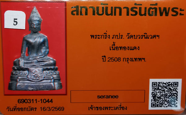 พระกริ่งภปร. วัดบวรนิเวศฯ เนื้อทองแดงรมดำ กริ่งดัง ตะไบหยาบ ปี2508 จ.กรงเทพฯ + บัตรG-pra สภาพเดิมค่ะ พระสภาพตามรูปทุกประการค่ะ