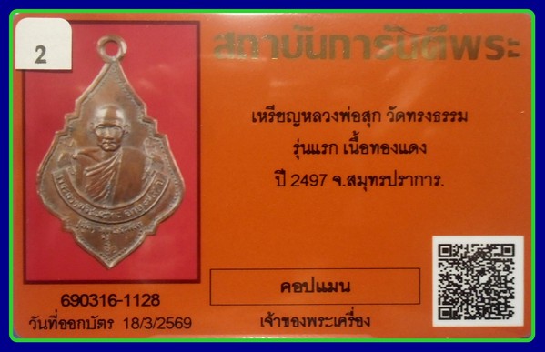 บัตรการันตี -1000-เหรียญรุ่นแรกหลวงพ่อสุก วัดทรงธรรม พระประแดง พศ.2497 จ.สมุทรปราการ