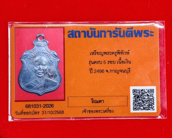 เหรียญพระครูพิทักษ์ รุ่นครบ5รอบ ปี 2496 จ.กาญจนบุรี เนื้อเงิน พร้อมบัตร