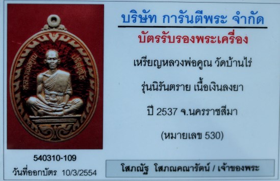 | ชื่อพระเครื่อง | เหรียญหลวงพ่อคูณ วัดบ้านไร่ รุ่นนิรันตราย เนื้อเงินลงยา หมายเลข 503 |