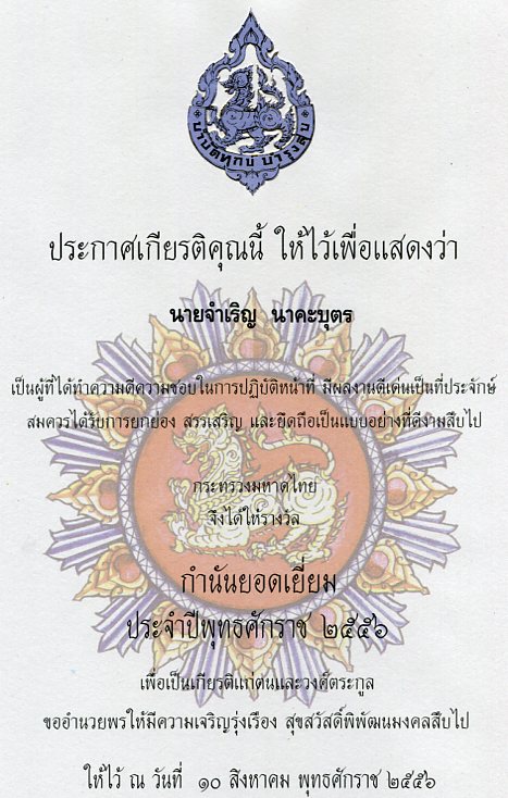รางวัลที่ภูมิใจมากอีกรางวัลครับ รางวัลกำนันแหนบทอง