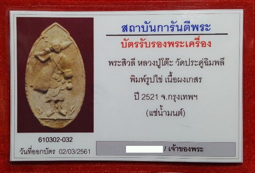 พระสิวลี ที่หลวงปู่โต๊ะปลุกเสก สร้างขึ้นในปี พ.ศ. 2521 เพื่อเป็นพระนำโชคโดยเฉพาะ จากประสบการณ์ของผู้ที่มีไว้บูชาต่างได้รับความเป็นสิริมงคลในชีวิต ทั้งทางด้านโชคลาภ การเงิน (ขนาดองค์พระสูงประมาณ 3.3 ซม.) ............. องค์นี้เป็นเนื้อผงเกสรแช่น้ำมนต์ คราบน้ำมนต์สวย สภาพสวย มีหน้าตาชัดเจน เห็นดวงตาชัดเจนทั้ง2ข้าง จมูกชัด ริมฝีปากชัด(((หน้าตาเหมือนเณรน้อยเจ้าปัญญา..อิคิวซัง..น่ารักมากๆครับ))) องค์พระไม่บิดเบี้ยว องค์พระหนาครึ่งซม.ในจุดที่หนาที่สุด บรรจุตะกรุดเงิน 1 ดอกตัวหนังสือยันต์หลังชัดเจนมาก เหลี่ยมทองยกซุ้มสวยๆเปอร์เซนต์ทองประมาณ 60-70 เปอร์เซนต์ครับพร้อมบูชามาพร้อมบัตรรับรอง...เช่าหาได้สบายใจครับ....