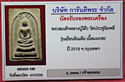 หลวงปู่โต๊ะ วัดประดู่ฉิมพลี พระสมเด็จเยือนอินเดีย ปี 2519 เนื้อเกสรแก่ผง ปี 2519 สภาพเดิม พร้อมบัครรับรอง