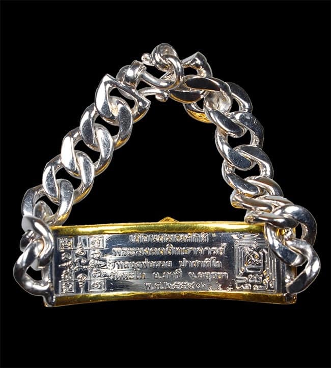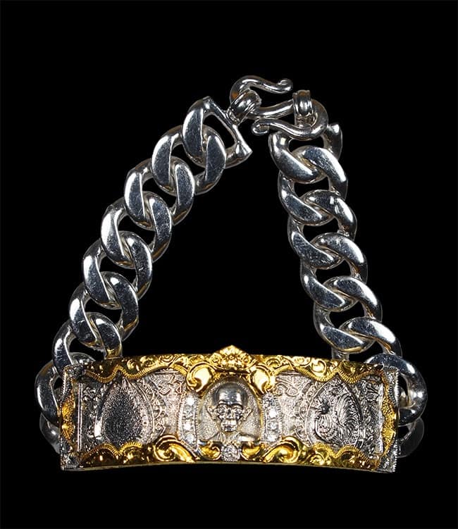 สร้อยข้อมือ หลวงพ่อรวย วัดตะโก รุ่นเลื่อนสมฯศักดิ์ เนื้อเงิน ขนาด 4 บาท เลี่ยมทองฝังเพชรแท้ ปี2559