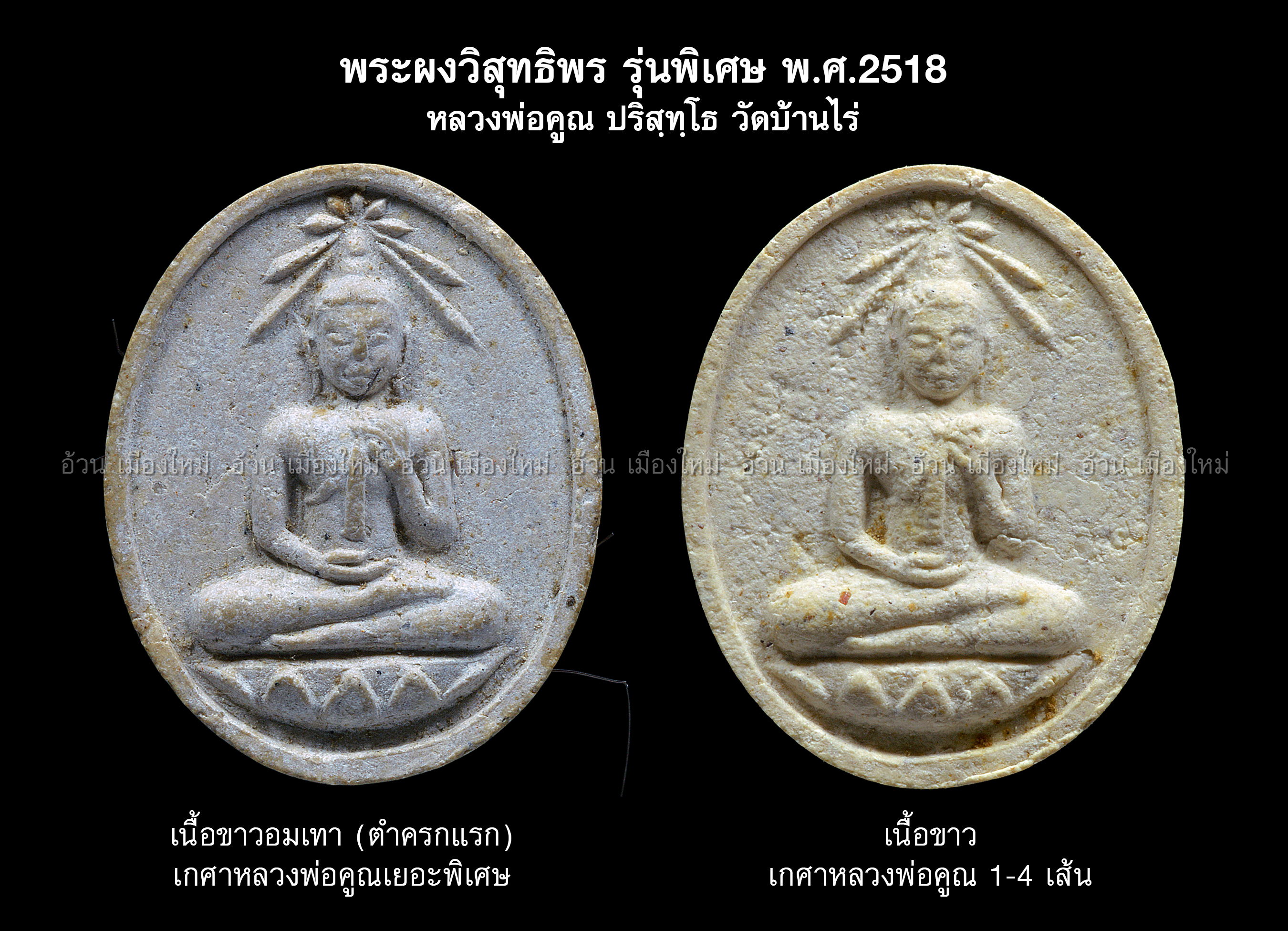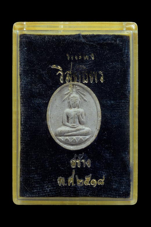 | พระผงวิสุทธิพร หลวงพ่อคูณ ปริสุทฺโธ วัดบ้านไร่ รุ่น พิเศษ ( เนื้อขาวอมเทา ตำครกแรก เกศาหลวงพ่อคูณเยอะพิเศษ ) พ.ศ.2518 ( กล่องเดิม ) / ผู้จัดสร้าง : คุณ เชิดศักดิ์ ภูมิสวัสดิ์ / พระนามประทานชื่อโดย : สมเด็จสังฆราชญาณสังวร วัดบวรนิเวศ โดยนามว่า วิสุทธิพร หมายถึง พระผู้บริสุทธิ์ นั่นหมายถึง หลวงพ่อคูณ ปริสุทฺโธ โดยสมเด็จสังฆราชมองเห็นหลวงพ่อคูณตั้งแต่ในยุคนั้นซึ่งท่านอายุราวๆ 51 ปี ว่าเป็นพระที่บริสุทธิ์จริงๆ / หลวงพ่อคูณท่านปลุกเสกชนวนมวลสาร ลงมือตำผงเอง ผสมผงเอง มวลสารสุดยอดทั้งมวล ขนาดตำผงพระ ท่านยังกลับสาก เอาด้านแหลมตำ และกล่าวว่าจะเป็น ยอดทุกทาง / มวลสาร ผงพระสมเด็จวัดระฆัง , ผงเสากุฎิของสมเด็จพระพุฒาจารย์ ( โต ) วัดระฆัง , ผงสมเด็จพระสังฆราช ( ป๋า ) วัดโพธิ์ , ผงสมเด็จพระญาณสังวร , ผงสมเด็จจิตรลดา วัดบวรนิเวศ , ผงไตรมาสหลวงพ่อคูณ ปริสุทฺโธ , ผงหลวงปู่โต๊ะ วัดประดู่ฉิมพลี , ผงหลวงพ่อวัดปากน้ำ , ผงหลวงพ่อโสธร , ผงพระสมเด็จปิลันทน์ , ผงพระสมเด็จบึงพระยาสุเรนทร์ , ผงพระวัดสามปลื้ม , ผงพระบาง , ผงสมเด็จพระสังฆราช ( แพ ) , ผงพระกำแพงสรรค์ , ผงนางพญางิ้วดำ , ผงใบเงินใบทองทำน้ำพุทธมนต์ในพิธีพุทธาภิเษกของหลวงพ่อคูณ , ลูกอมหลวงพ่อพริ้ง วัดบางปะกอก , ลูกอมหลวงปู่ทิม อิสริโก วัดละหารไร่ , เกศาหลวงพ่อคูณ , ว่าน 108 / ปลุกเสก : ณ วัดสระแก้ว อ.เมือง จ.นครราชสีมา วันที่ 29 มิถุนายน พ.ศ.2517 เวลาประมาณ 23.00 น. พิธีด้วยการสวดมนต์ และนั่งบริกรรมปลุกเสกโดยได้ดับไฟทั้งหมด จะมีก็แต่เทียนที่ใช้ในการปลุกเสกเท่านั้นพอถึงเวลาประมาณ 02.30 น. ผู้นั่งสังเกตการณ์อยู่นอกกุฏิ ก็ต้องตื่นเต้นประหลาดเมื่อมีแสงสว่างเจิดจ้าติดต่อกันเป็นระยะ ถึง 5 ครั้งด้วยกัน |
