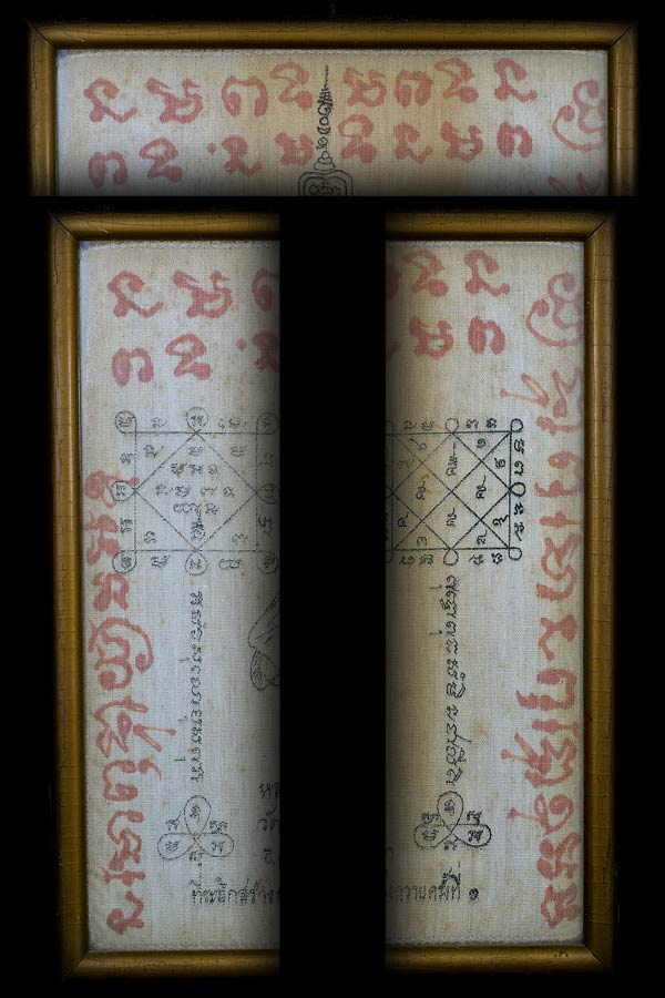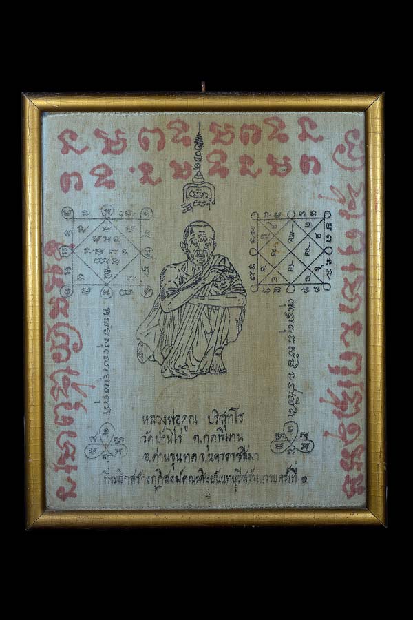 ผ้ายันต์ ( ผ้าครู ) หลวงพ่อคูณ ปริสุทโธ วัดบ้านไร่ ที่ระลึกสร้างกุฏิสงส์ คณะศิษย์นนทบุรี สร้างถวาย พ.ศ.2529 / ปั๊มตราวัดบ้านไร่ , 8.5 X 10.5 นิ้ว / ผ้าครู : หลวงพ่อคูณ ได้ให้ผ้าครู ผ้าดิบสีขาว ที่ท่านไว้ใช้ในพิธีสำคัญต่างๆ เช่น พิธีปลุกเสกตะกรุดเสาร์ 5 และ เครื่องรางต่างๆ รวมถึงใช้ในพิธีต่างๆ จัดสร้างพร้อมเหรียญผ้าป่านนทบุรี พ.ศ.2529 แถวที่ 1 บน : นะ มะ พะ ทะ มะ พะ ทะ นะ แถวที่ 2 บน : พะ ทะ นะ มะ ทะ นะ มะ พะ แถวข้างขวามือหลวงพ่อ : นะ โม พุท ธา ยะ มะ อะ อุ แถวข้างซ้ายมือหลวงพ่อ : ยะ ธา พุท โม นะ พุท โธ อุ อะ มะ / ผู้จัดสร้าง : คุณ ไกรวิทย์ นวสถาพร และ คณะศิษย์นนทบุรี / วัตถุประสงค์ : เพื่อสมทบทุนสร้างกุฏิสงส์และนำคณะผ้าป่ามาทอดที่ วัดบ้านไร่ จากคณะศิษย์นนทบุรี / ปลุกเสก : 2 ไตรมาส / รายการ 1.ผ้ายันต์ 200 ผืน , 2.กระดาษยันต์ 200 แผ่น
