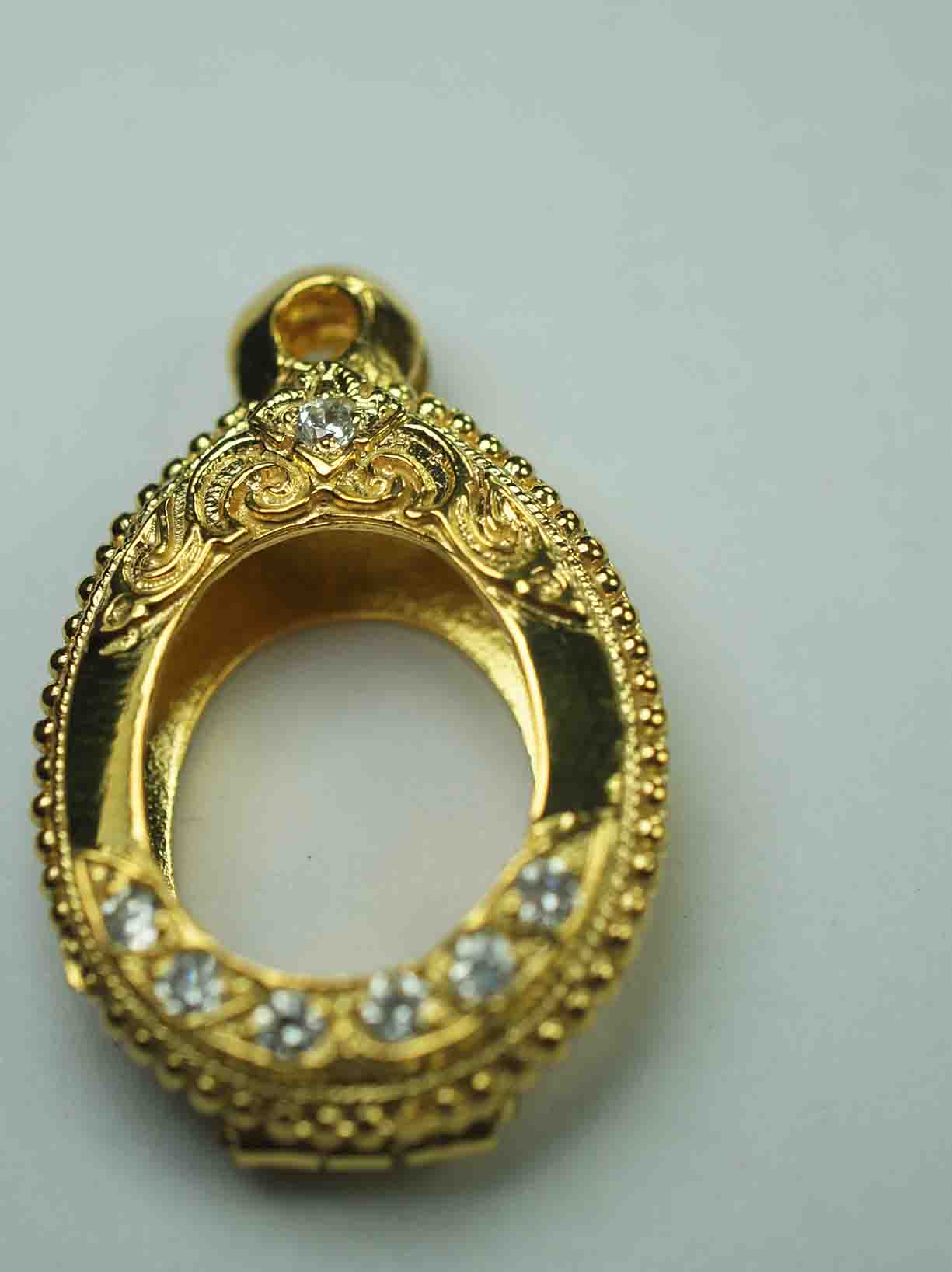 งานตลับเงินแท้ ( มือหนึ่ง ) ชุบทองแท้ ยกซุ้ม ข้างเม็ดไข่ปลา แกะลายทั้งใบ ฝังเพชร CZ เม็ด ใส่ เหรียญเม็ดแตงปู่ทวด หรือขนาดไกล้เคียง ขนาดความสูง 1.5 ซม. กว้าง 1 ซม. งานขึ้นมือ ( มาตรฐานงานตัวเดียวกับกรอบทองคำแท้ ) น้ำหนัก 5.68 กรัม รับประกันตามกฏการันตีพระทุกข้อกำหนด สินค้าทุกชิ้น ส่ง EMS * ครับ การันตรีโดยศรีเมืองระยอง พระเครื่อง ( ที่ร้าน มีบริการรูดบัตรเครดิต ฟรีชาร์จ ) สนใจ โทร 0821-999799