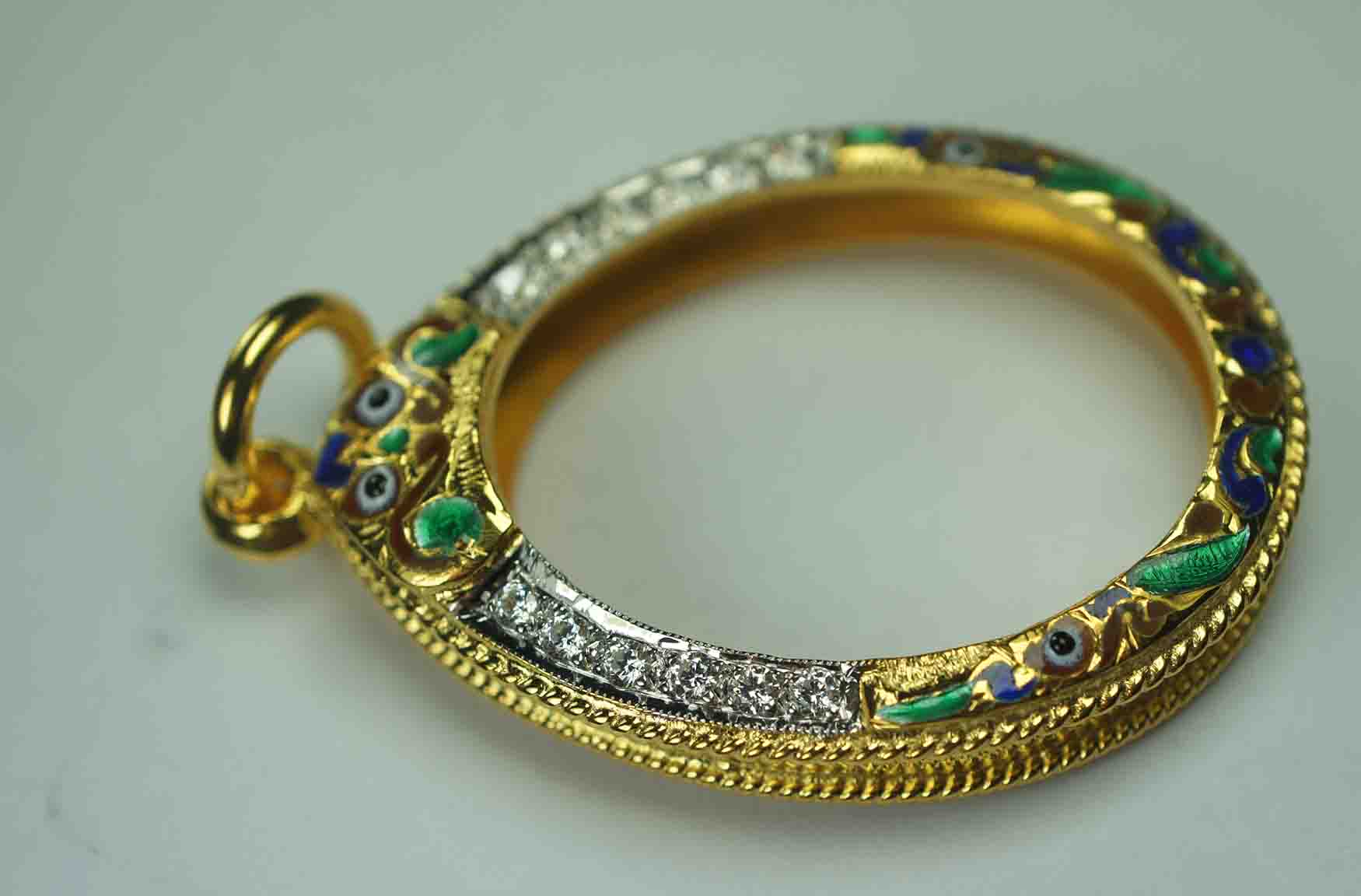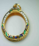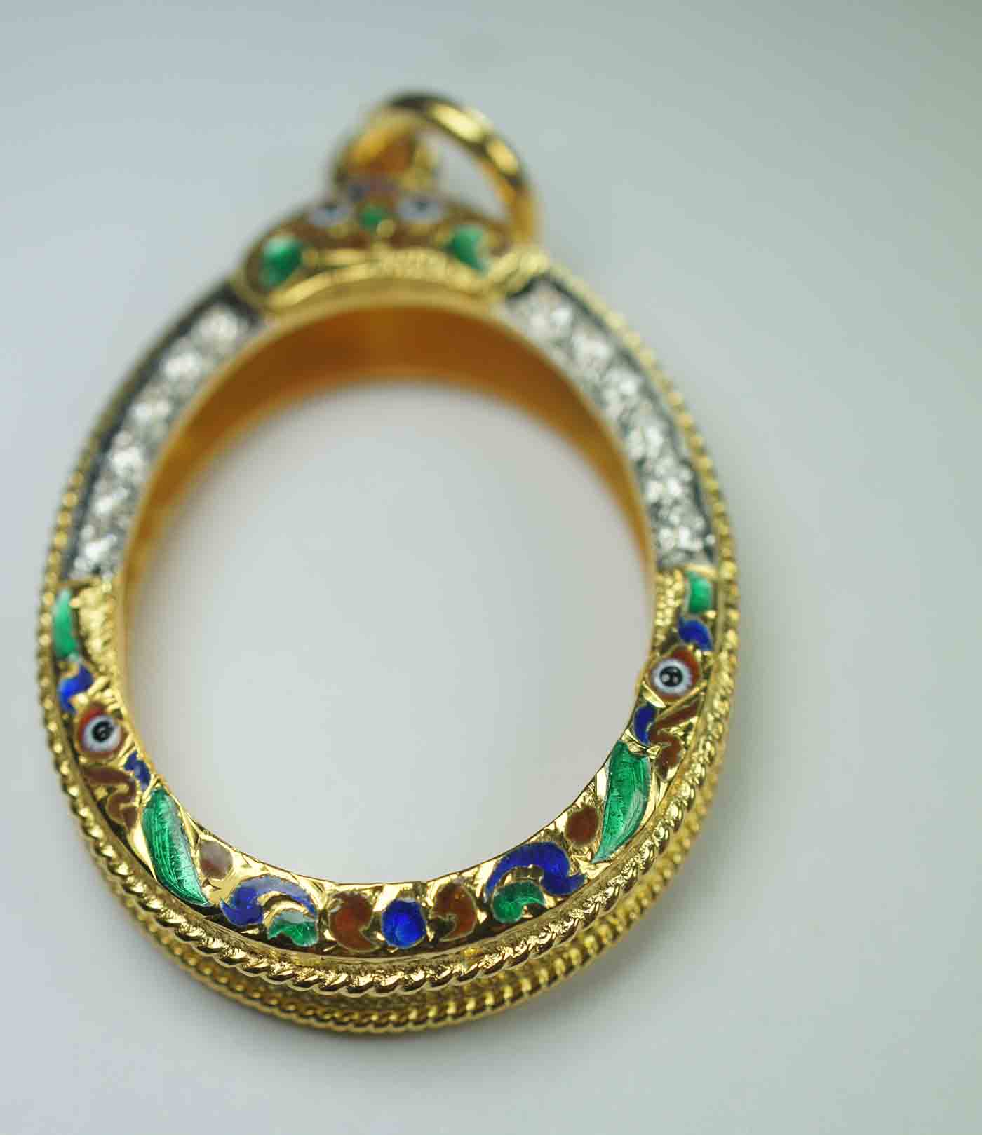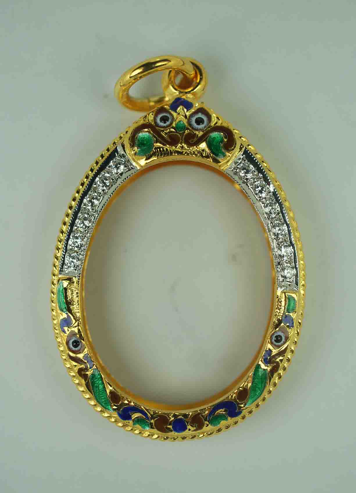 งานกรอบเงินแท้ ( มือหนึ่ง ) ชุบทองแท้ รูปไข่ ยกซุ้ม หัวสิงห์ ลงยา ฝังเพชร ชุบหน้าขาว ใส่เหรียญ ผูกพัทธสีมา หลวงปู่ทิม หรือขนาดไกล้เคียง ขนาดความสูง 2.8 ซม. กว้าง 2.2 ซม. งานขึ้นมือ ( มาตรฐานงานตัวเดียวกับกรอบทองคำแท้ ) น้ำหนัก 7.08 กรัม ฝังเพชร CZ 12 เม็ด การันตรีโดยศรีเมืองระยอง พระเครื่อง