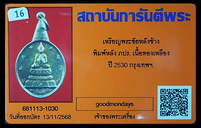 เหรียญพระชัยหลังช้าง เนื้อทองเหลือง ปี2530 หลวงพ่อ |