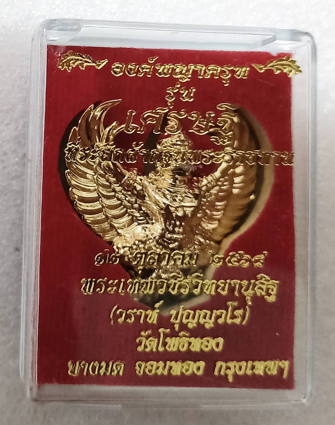 พญาครุฑ ลอยองค์เนื้อทองทิพย์ ขนาด๓x๓ซม. พระอาจารย์วราห์ วัดโพธิ์ทอง กท. รุ่นเศรษฐี งานกฐินปี๖๘ โค๊ต ว. สวยชัด รับประกันครับ