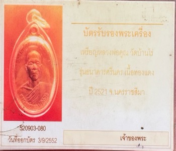 หลวงพ่อคูณ รุ่นศรีนคร ปี 21 เลี่ยมทอง พร้อมบัตรจีพระ