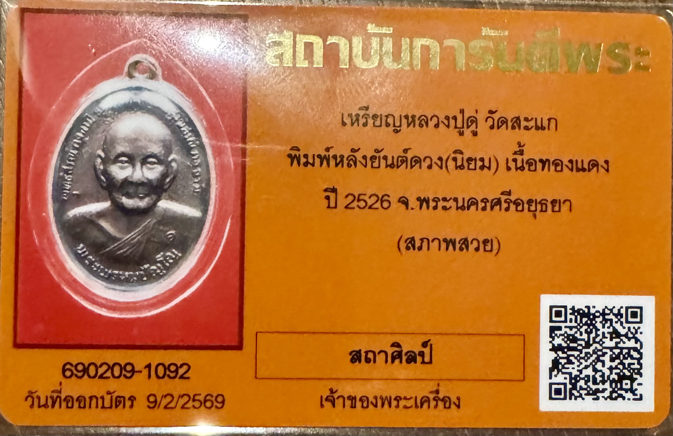 เลี่ยมทอง บัตรสภาพสวย รายละเอียดการจัดสร้างเหรียญยันต์ดวง (2526) ด้านหน้า: รูปเหมือนหลวงปู่ดู่ครึ่งองค์ ด้านหลัง: ยันต์ดวงของหลวงปู่ ซึ่งหลวงปู่ตรวจสอบและอนุญาตให้นำมาใช้ ชนิดเนื้อเหรียญและจำนวน: เนื้อทองคำ: 16 เหรียญ เนื้อเงิน: 200 เหรียญ (รวมแบบยันต์ทะลุและไม่ทะลุ) เนื้อทองแดง: 10,000 เหรียญ