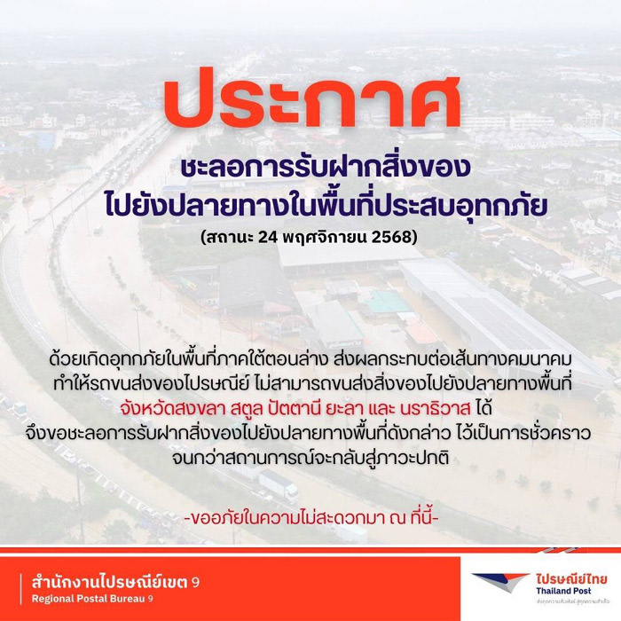 ประกาศ ชะลอการจัดส่งพัสดุไปยังปลายทางในพื้นที่ประสบอุทกภัย ในพื้นที่ภาคใต้ตอนล่าง จนกว่าสถานการณ์จะกลับสู่สภาวะปกติ