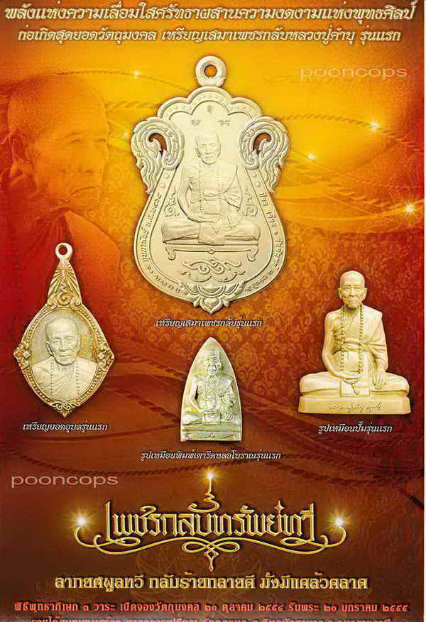 หลวงปู่คำบุ ได้พิจารณาแบบและเอ่ยปากชมว่า แบบสวยดี พร้อมทั้งเขียนใบอนุญาตจัดสร้างวัตถุมงคล รุ่น เพชรกลับทรัพย์ทวี ซึ่งเป็นเหรียญเสมาเพชรกลับ รุ่นแรก โดยหลวงปู่เมตตาออกแบบ และเขียนอักขระยันต์เพื่อใส่ในเหรียญ และจารแผ่นยันต์ชนวนโลหะที่ใช้ในการจัดสร้างวัตถุมงคล อีกทั้งยังปลุกเสกชนวนโลหะที่ใช้ในการจัดสร้างวัตถุมงคล หลวงปู่คำบุ รุ่น เพชรกลับทรัพย์ทวี เมื่อวันที่ 6 กันยายน 2554 วัตถุประสงค์ในการจัดสร้าง เพื่อสมทบทุนสร้างศาลาการเปรียญ และสร้างรูปหล่อรูปเหมือนหลวงปู่คำบุ (ยืน) ขนาดเท่าจริง ไว้ตั้งภายในเจดีย์วัดกุชมภู สอบถามรายละเอียดสั่งจองโทร.ร่มโพธิ์ 081-441-3424 หรือ 080-046-5240 (pooncops) |