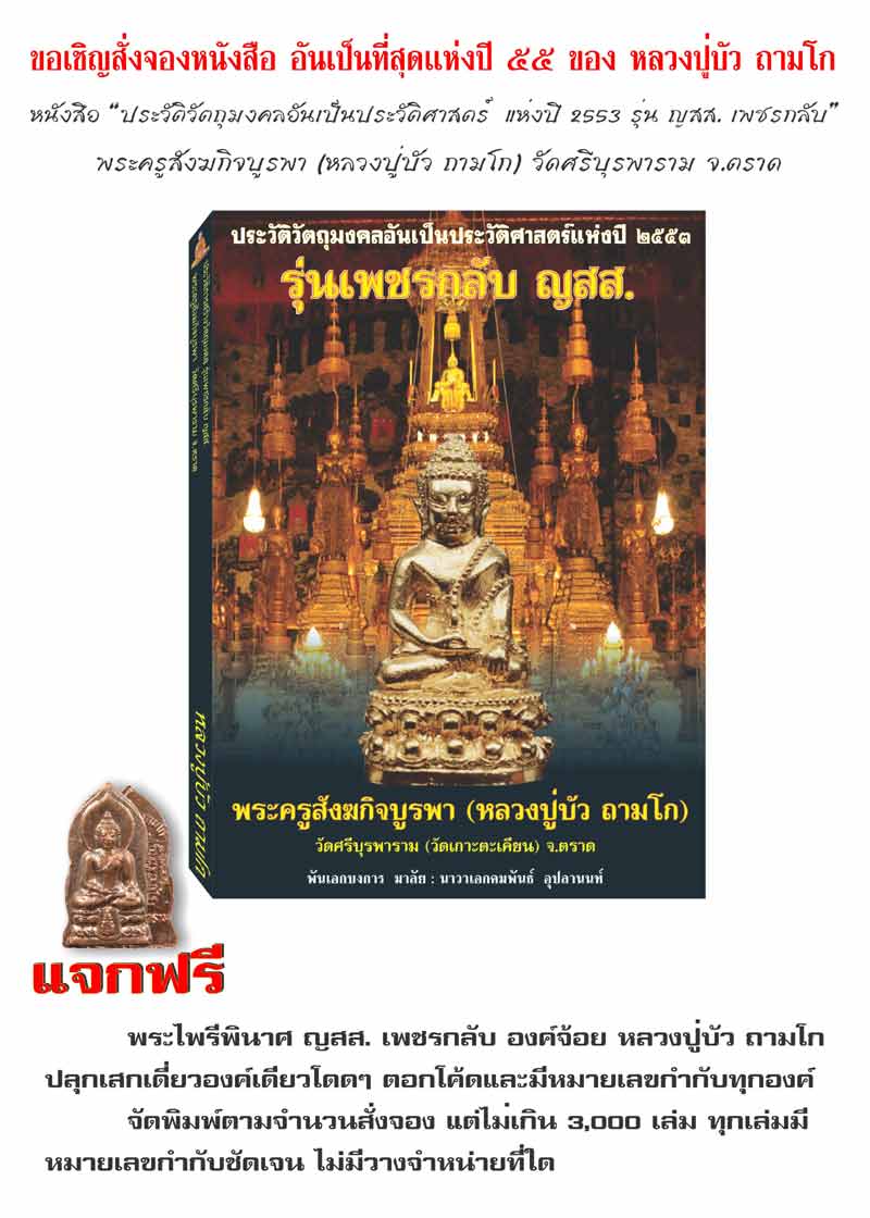 ปกแข็งอย่างดีหนา 150 หน้า มีภาพประมาณ 200 ภาพ ราคาเล่มละ 599.- บาท ค่าจัดส่ง EMS ทั่วประเทศเล่มละ 100.- บาท (ยกเว้นผู้ที่จะมารับหนังสือเองไม่ต้องเสียค่าส่ง) กำหนดสิ้นสุดวันรับจอง 29 กพ.55 พร้อมส่งมอบหนังสือประมาณวันที่ 10 มีค.55 ท่านที่จองรบกวนกรุณาโอนเงินเป็นเศษสตางค์ ตัวอย่างเช่น 699.05 บาทหรือ 699.11 บาท เป็นต้น เพื่อสะดวกในการตรวจสอบ พร้อมทั้งแจ้งชื่อและที่อยู่ที่ต้องการให้จัดส่งในกระทู้ด้วยครับ วัตถุมงคลชุดเพชรกลับ หลวงปู่บัว ถามโก นับได้ว่าเป็นวัตถุมงคลที่มีเอกสารครบถ้วนที่สุด นับตั้งแต่ครั้งแรกออกเอกสารการจองมีจำนวนสร้างและราคาชัดเจน ครั้งที่สองออกสุจิบัตรสรุปจำนวนการสร้างจำนวนที่แท้จริงและภาพในวันประกอบพิธีที่วัดพระแก้ว สุดท้ายครั้งที่สามเป็นหนังสือรวมเพชรกลับที่กำลังจะออกในเดือนมีนาคม 55 นี้ ทั้งหมดนี้ถือได้ว่าเป็นการออกเอกสารครบถ้วนกระบวนความที่สุด |